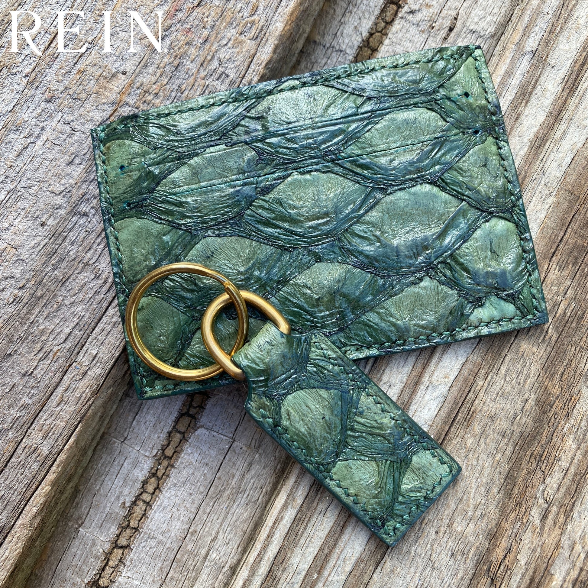 The matching key fob is an elegant design with a nod to our equestrian heritage. This piece was created from matching green fish skin leather, and features brass hardware.